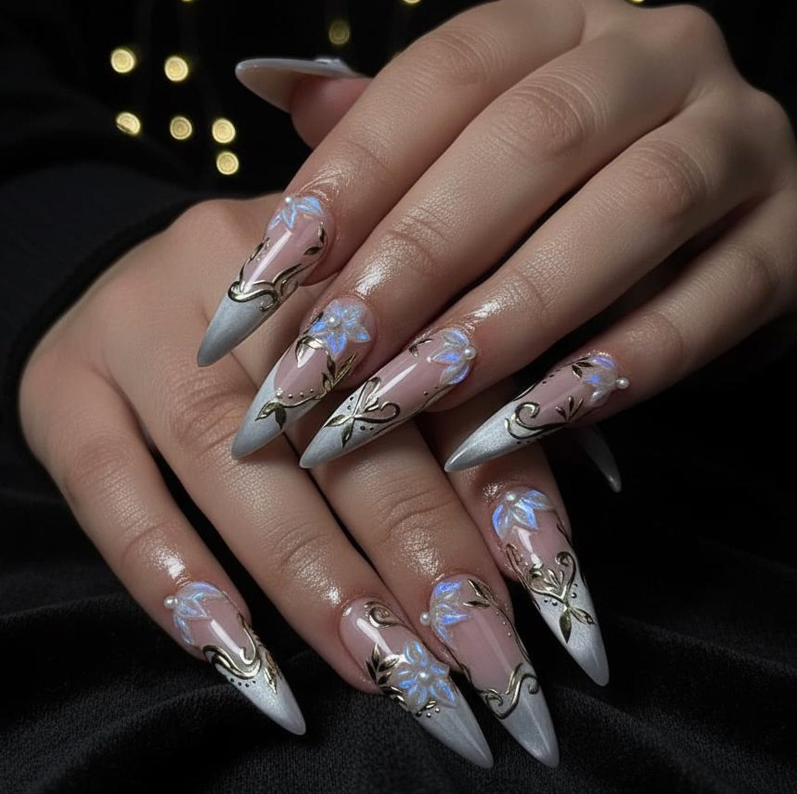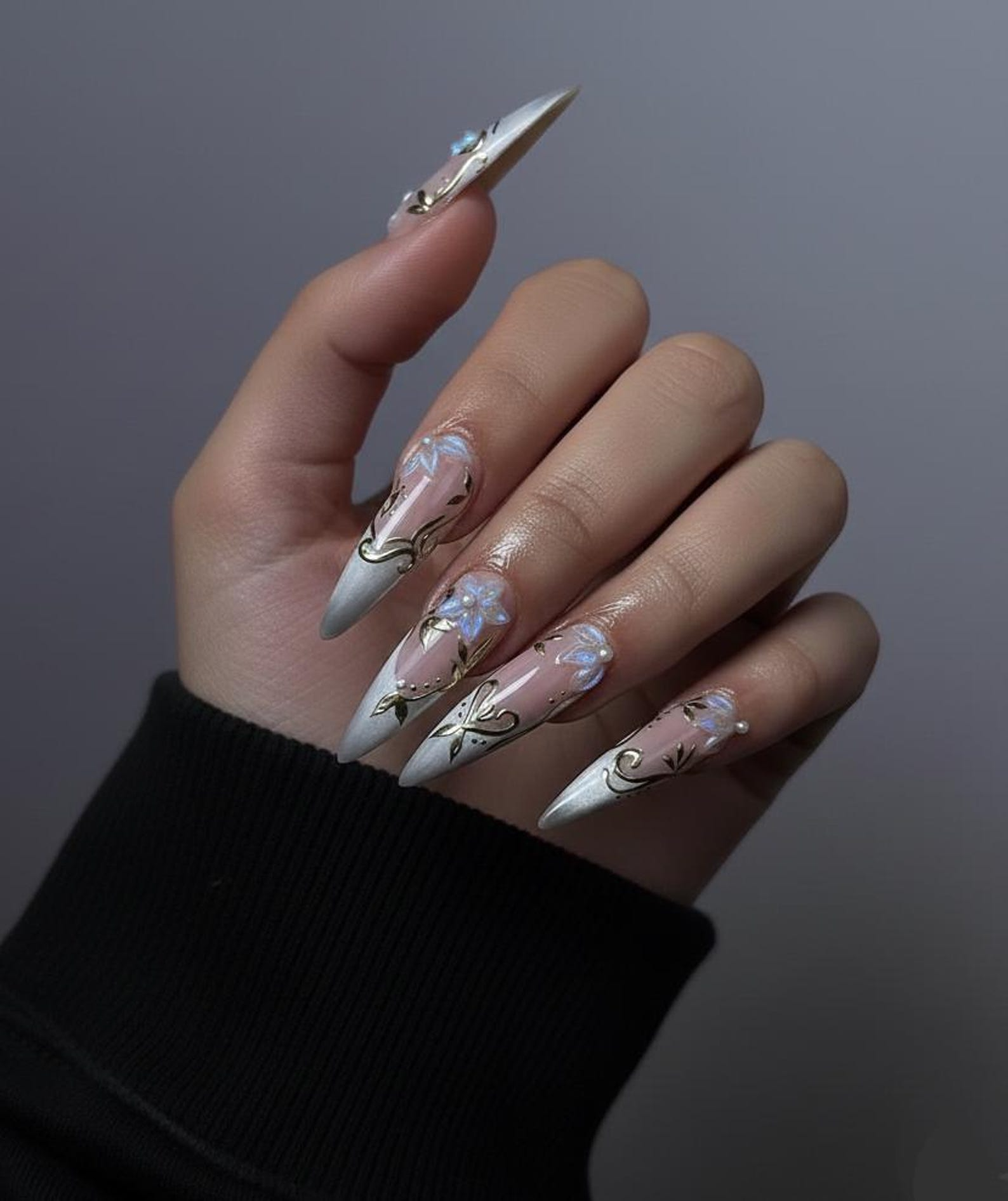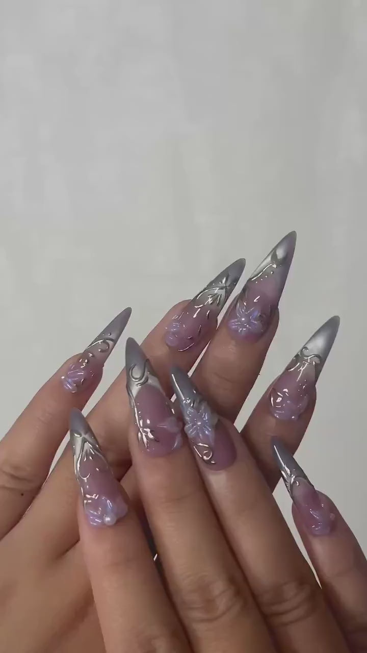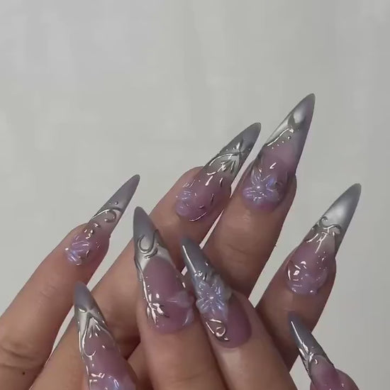 Spring Gothic Blossom Pressons Nails | Dusty Mauve Floral Nails | Iridescent 3D Flower Nail Art | Gold Vine Luxury Nail Set | JB267EC
