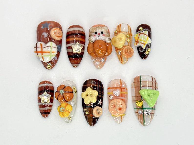 Kawaii 3D Cat Press On Nails | Cute Autumn Plaid Nails | Cat & Plaid 3D Nail Set | Handmade Kawaii Nail Set | Autumn Inspired | JB594HC