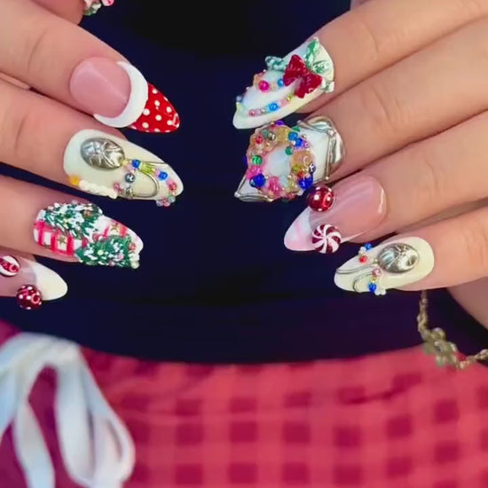 Celebrate the holidays in style with this DoryNail Holiday Candy Wreath set featuring 3D Christmas trees, candy bows, wreaths, and festive lights. The red, gold, and nude tones with pearl and bead accents make this set a joyful statement for the season. 🎄🍬✨