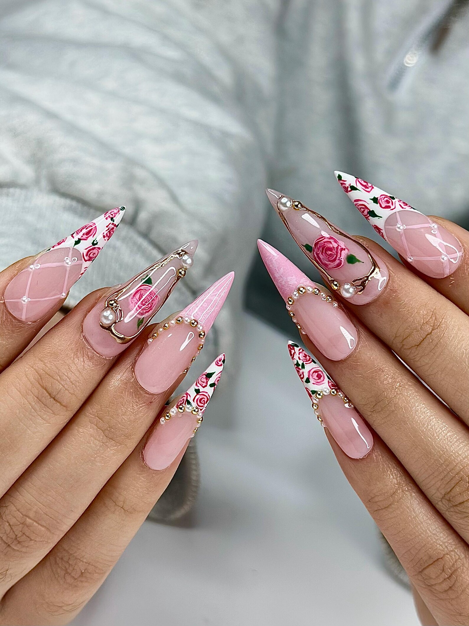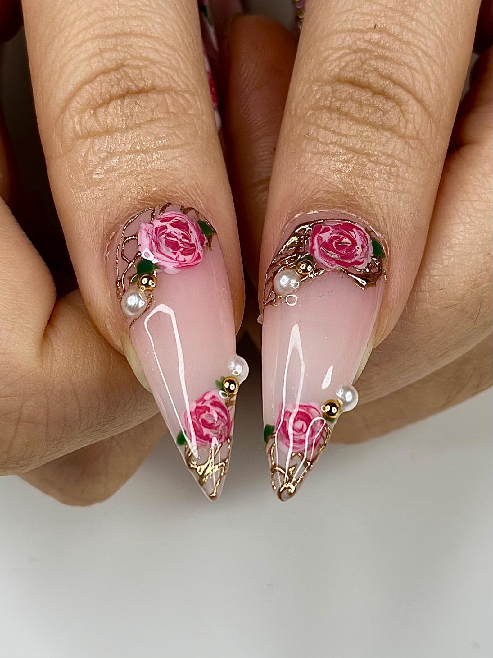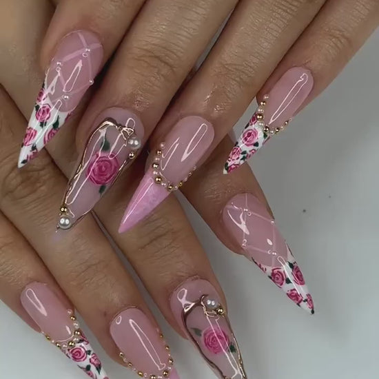 Vintage Rose Stiletto Press On Nails | Pink Rose Bridal Nails for Women | French Tip Floral Nails | Pearl Gold Nail| Romantic Nail |HB1276HC