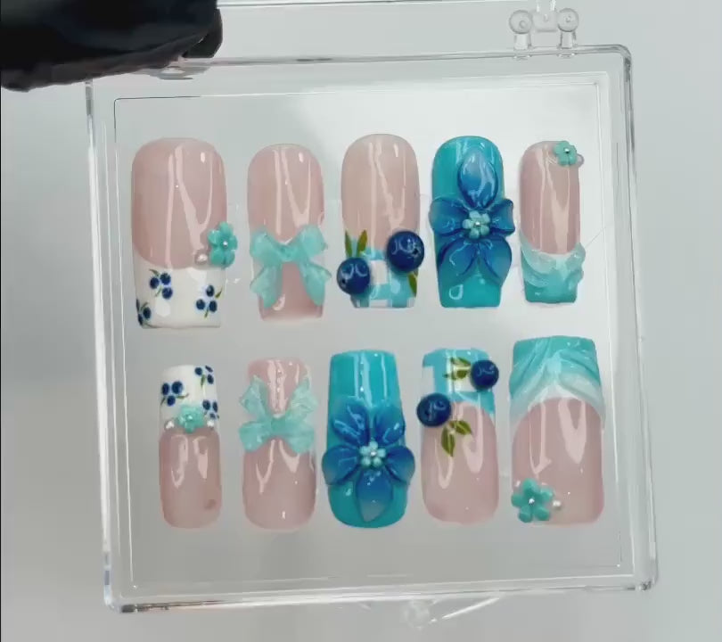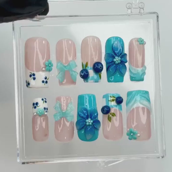 3D Blue Flower Press on Nails | Elegant Blue Floral Nail Art | Handmade Summer Nails | Gift for her | Summer Vibes | Beach nails | HB967DK