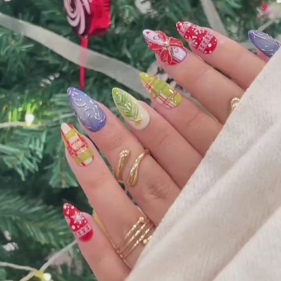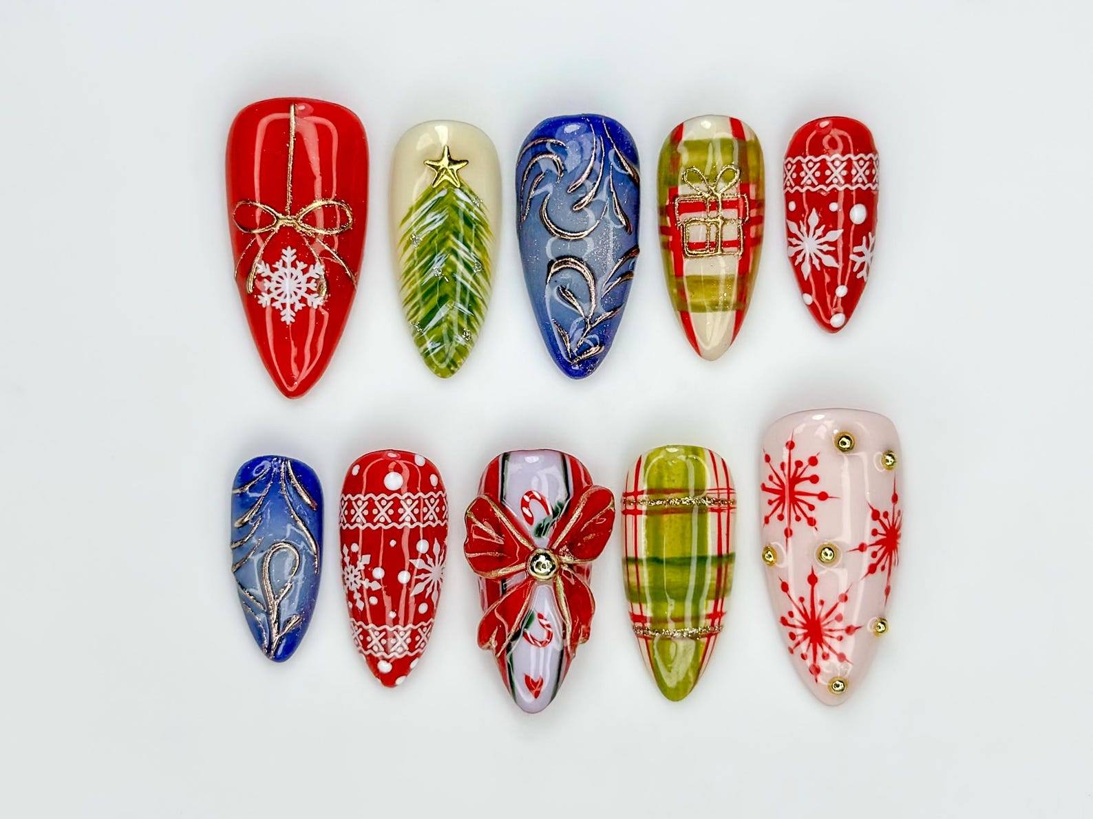 Red & Green Christmas Gift Press On Nails | Christmas Gift Box Nail Art | 3D Ribbon Bow Accent | Snowflake and Festive Pattern Nails|JB241EC