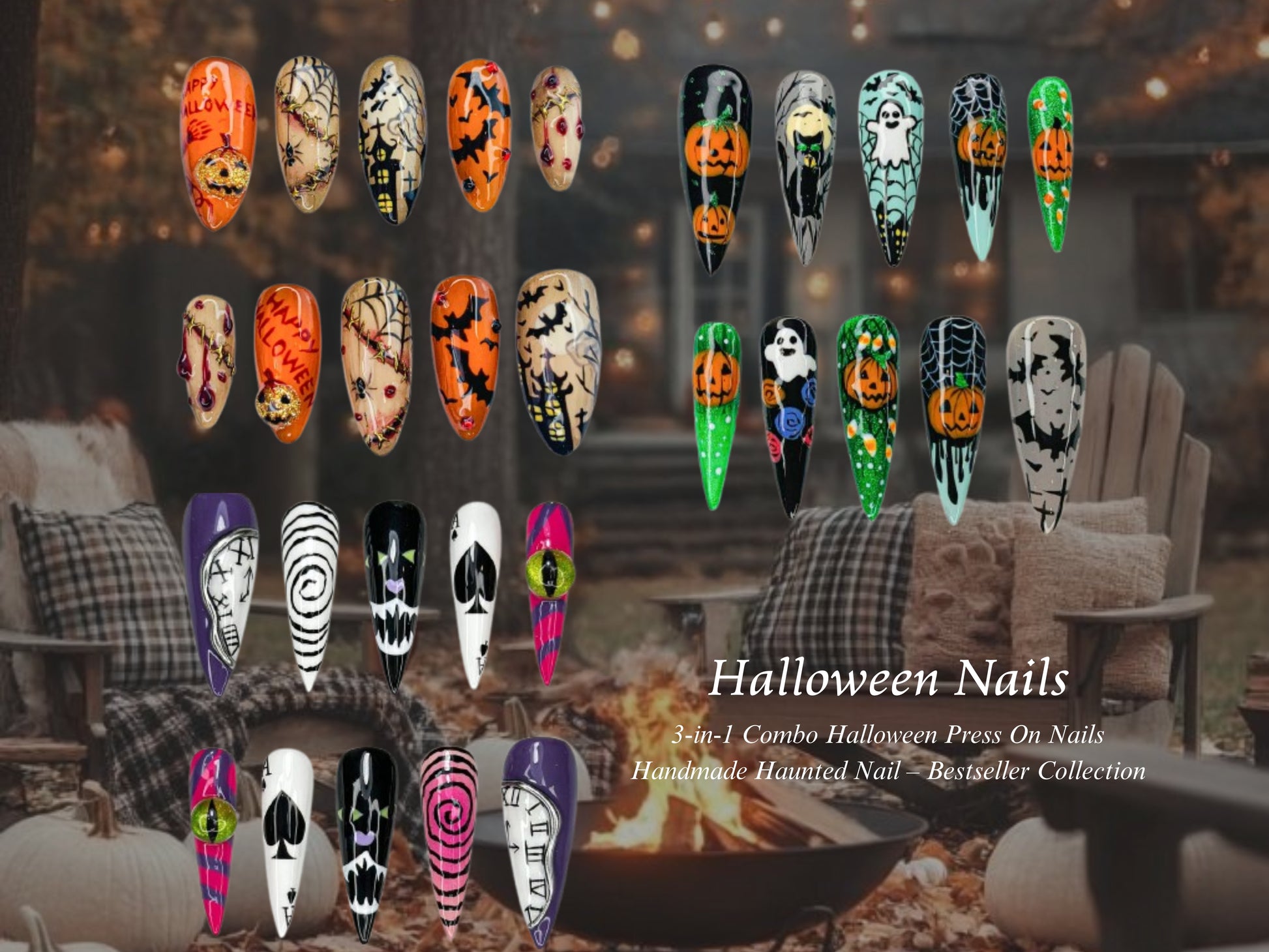 Combo Creepy Cute Halloween Nails | 3D Pumpkin, Ghost & Spider Web Nail Art | Handmade Haunted Press On Set