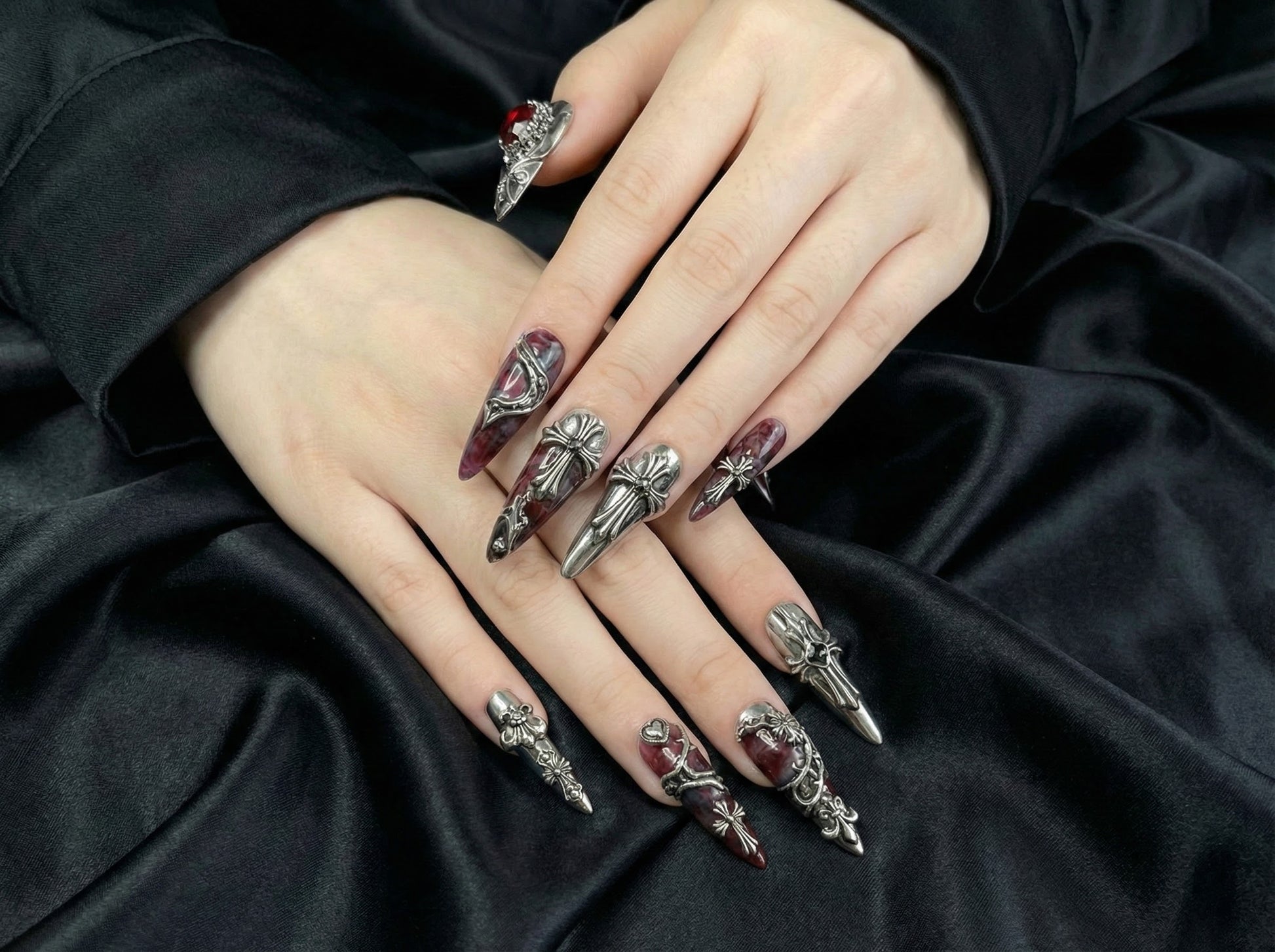 Gothic Blood Cross Press On Nails | Dark Red Medieval Nails | Silver Armor Nail Art | Gothic Cross Statement Nails | JB265EK