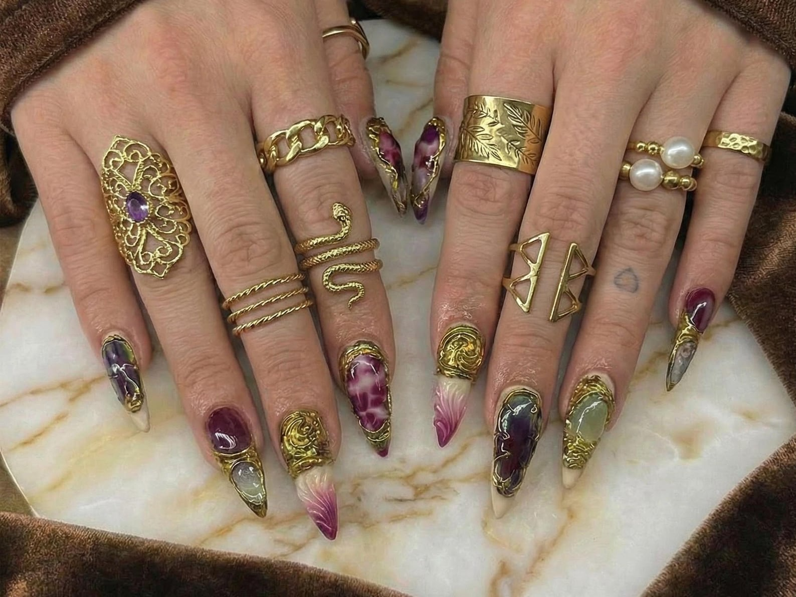 Gothic Garnet Gold Press On Nails | Frech Tips Gold Couture Nail Art | Burgundy Jade Statement Nails | Handmade Luxury Stiletto Set JB270EC