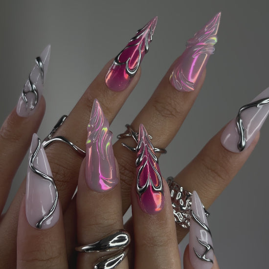 Turn heads with this DoryNail Chrome Flame Aura set — featuring bold pink iridescent tones, sculpted silver chrome waves, and futuristic 3D details. Perfect for fashion lovers who crave modern luxury and edgy glamour. 💖🔥✨