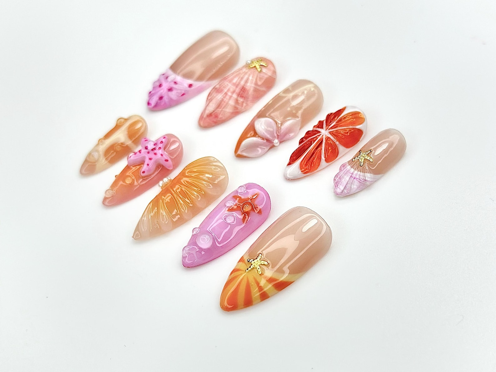 Tropical Summer Splash Press On Nails | Cute Starfish & Shell Design | Bright Sunset and Beach Theme Nails | 3D Ocean Nail Art | JB979EK