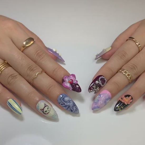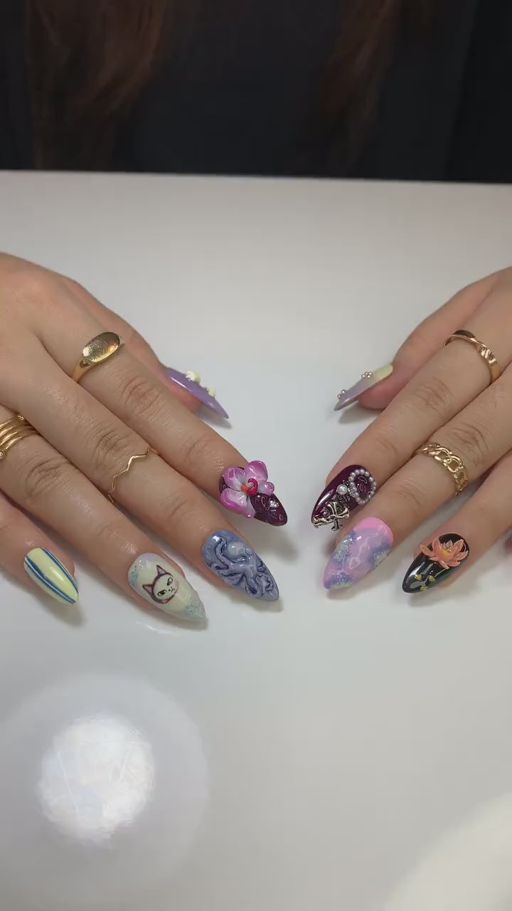 Whimsical Violet Press On Nails | 3D Cat & Orchid Nail Art | Abstract Swirl Gothic Pearl Nails | Handmade Nail Set| Artistic Nails | JB981HC