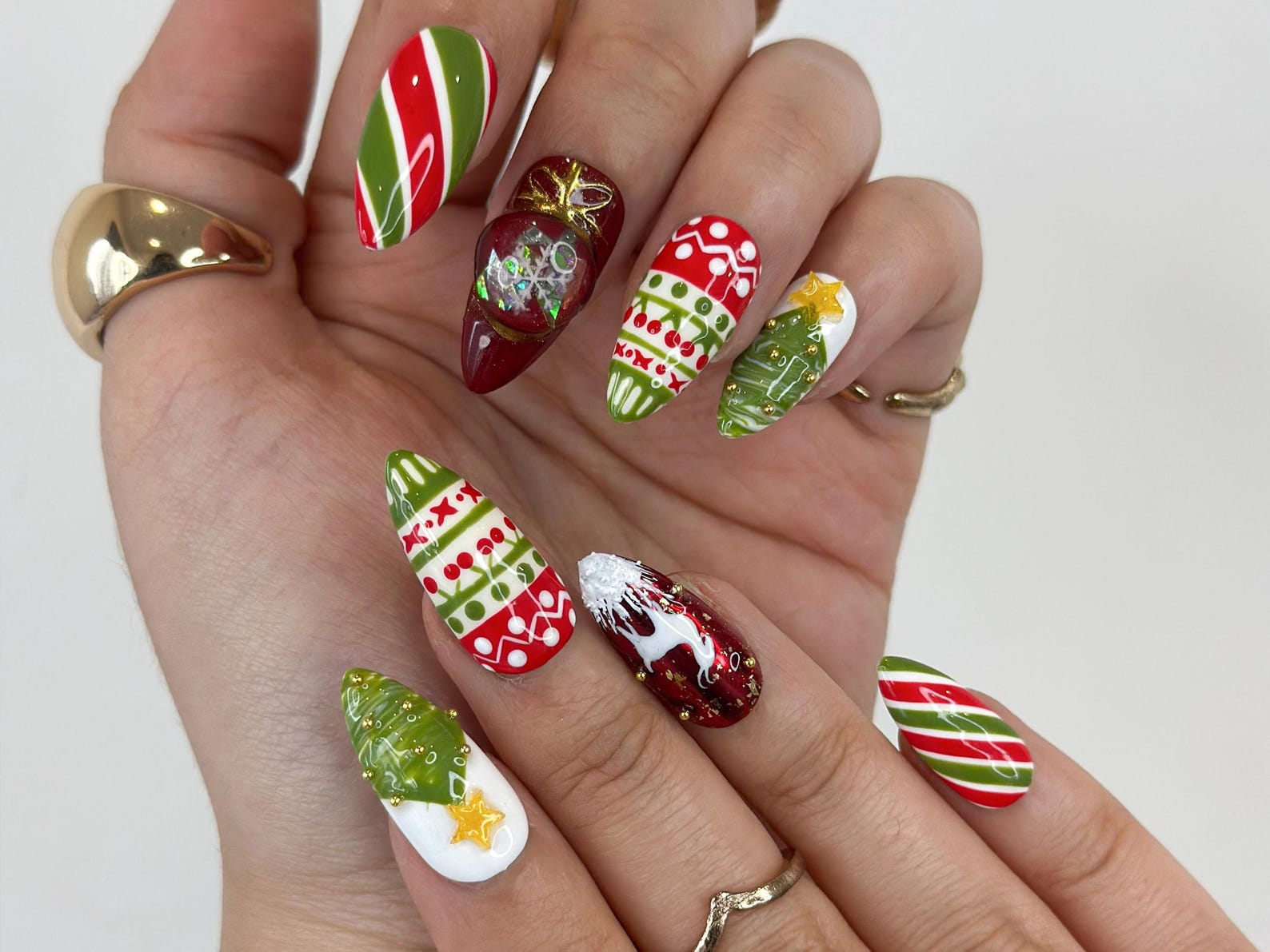 This DoryNail Christmas set features bold red, green, and white designs with festive patterns, cute reindeer art, ornament details, and 3D Christmas tree accents — a fun, vibrant holiday look.