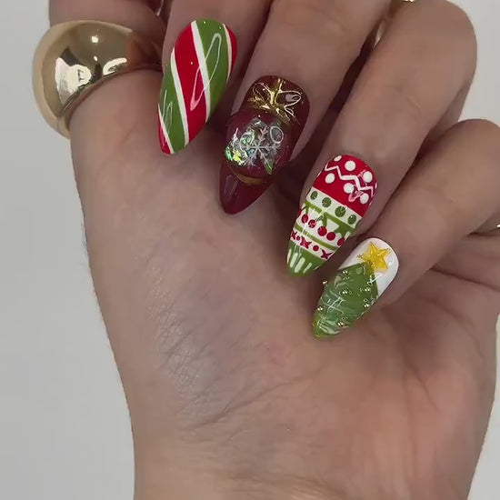Christmas Reindeer Red Press On Nails | Red Green Christmas Nail Art | Snow & Tree Design| Holiday Glitter Nails| Winter Press Ons| HB1200HC