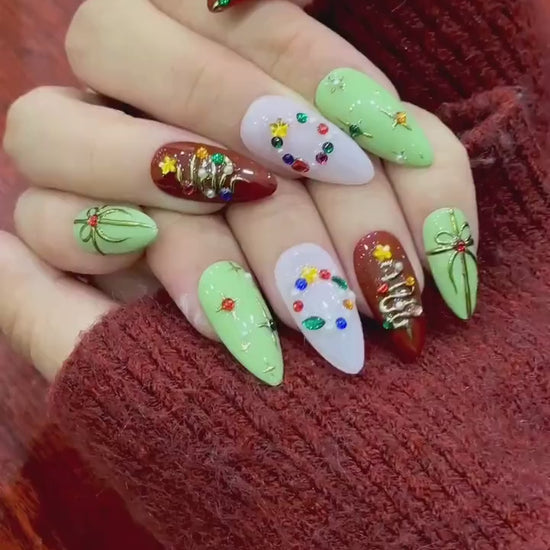 Candy Light Christmas Press On Nails | Red Green Holiday Nail Art | 3D Star & Ornament Nail Art | Festive Winter Nail Set | HB1211EK