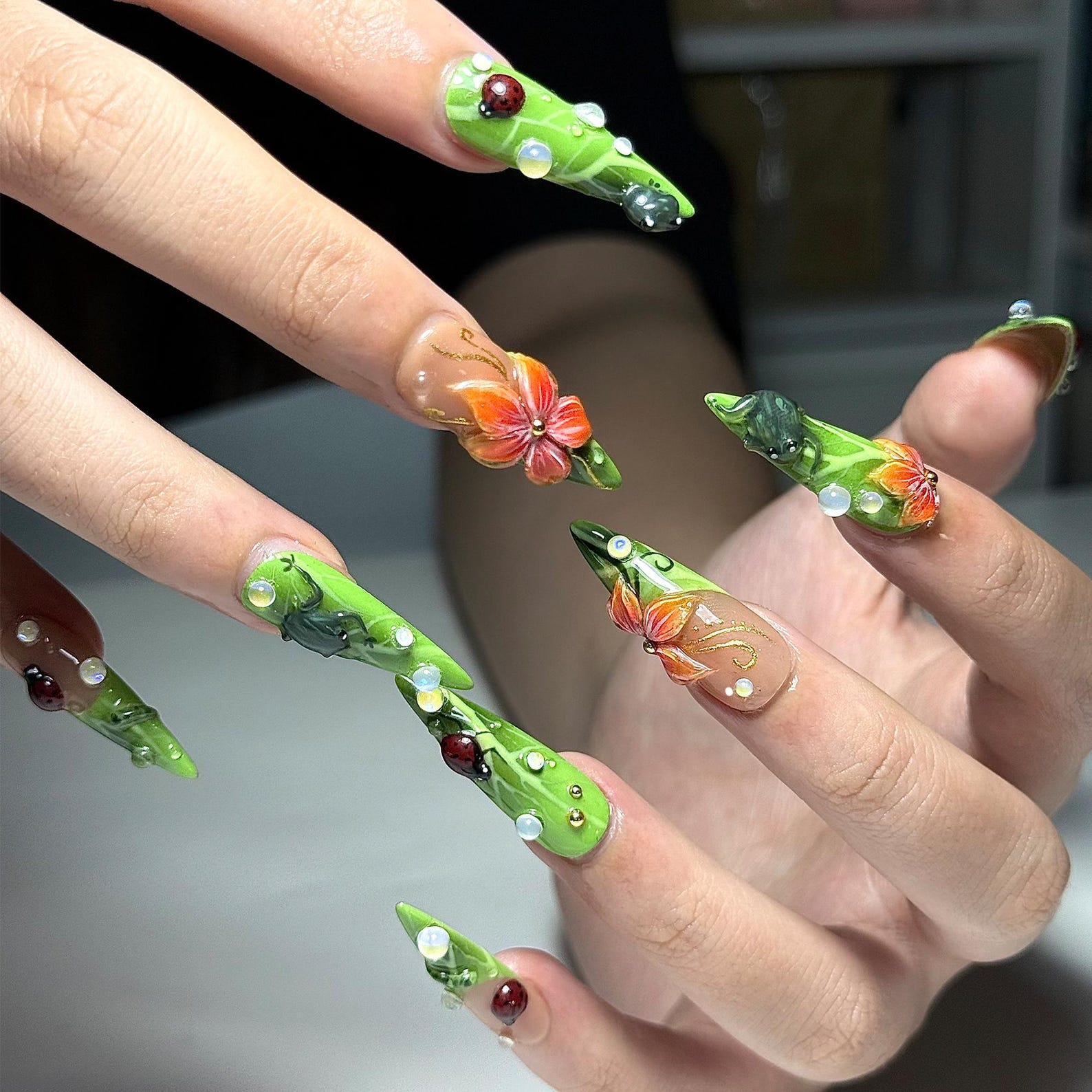 Green Floral Press On Nails with Ladybug and Pearl | 3D Nature Nails in Long Almond | Handmade Spring Nails for Wedding, Vacation | JB330N