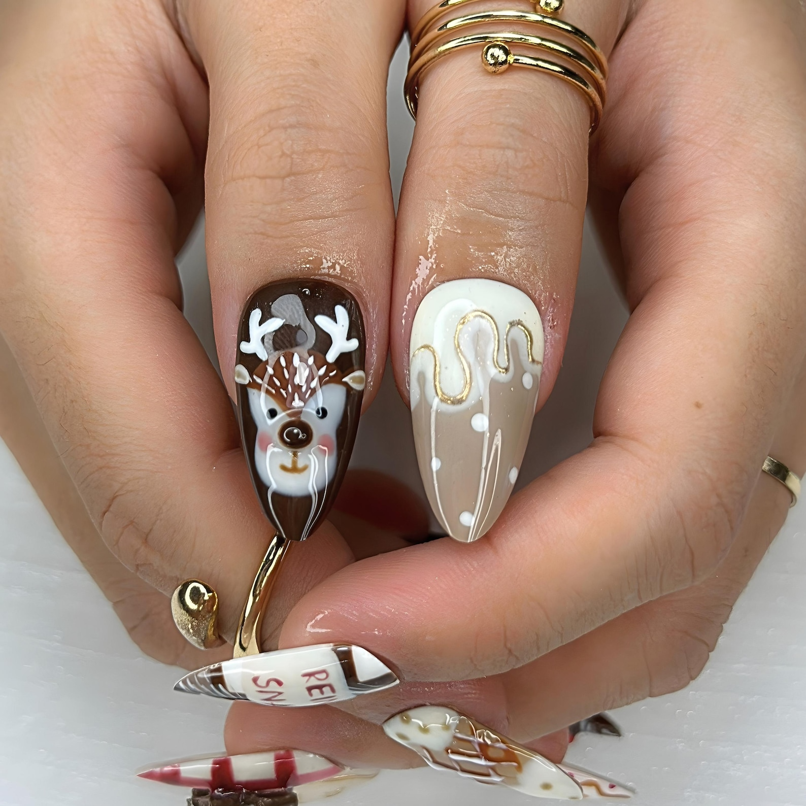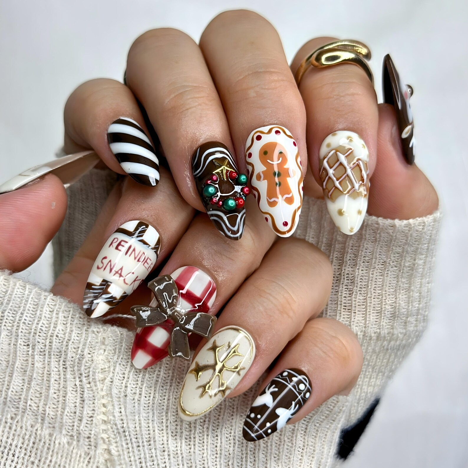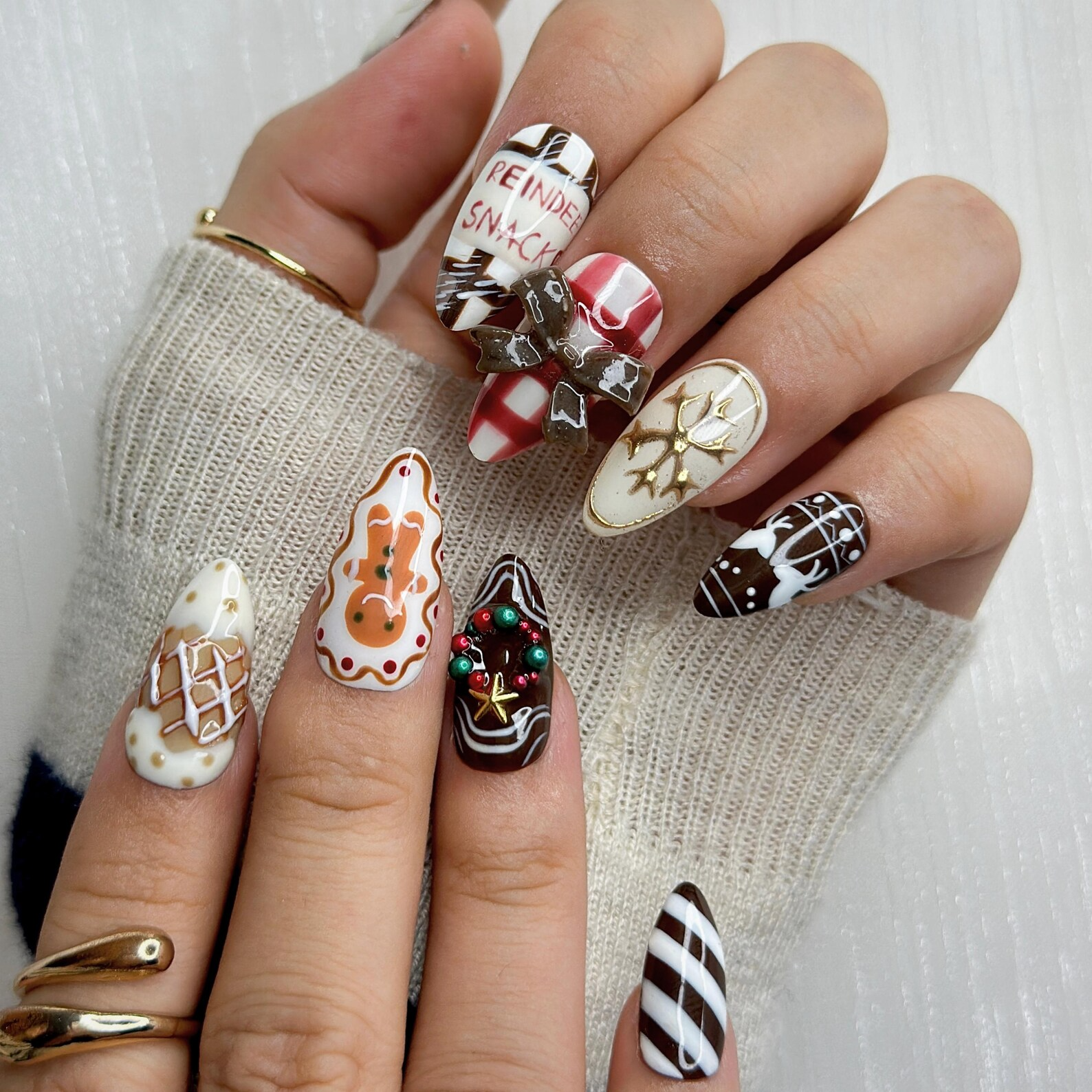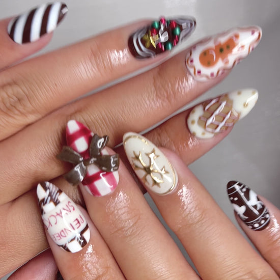 Sweet Harmony Christmas Press On Nails | 3D Bow & Reindeer Design | Gingerbread Cookie Nail Art | Holiday Nail Set | HB1000YG