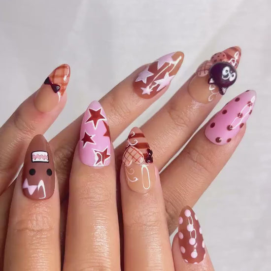 Chocolat Bear Cute Press On Nails | Kawaii Cartoon & 3D Cat Nails | Pink Brown Retro Nail Art | Handmade Fun Press Ons | JB221EC