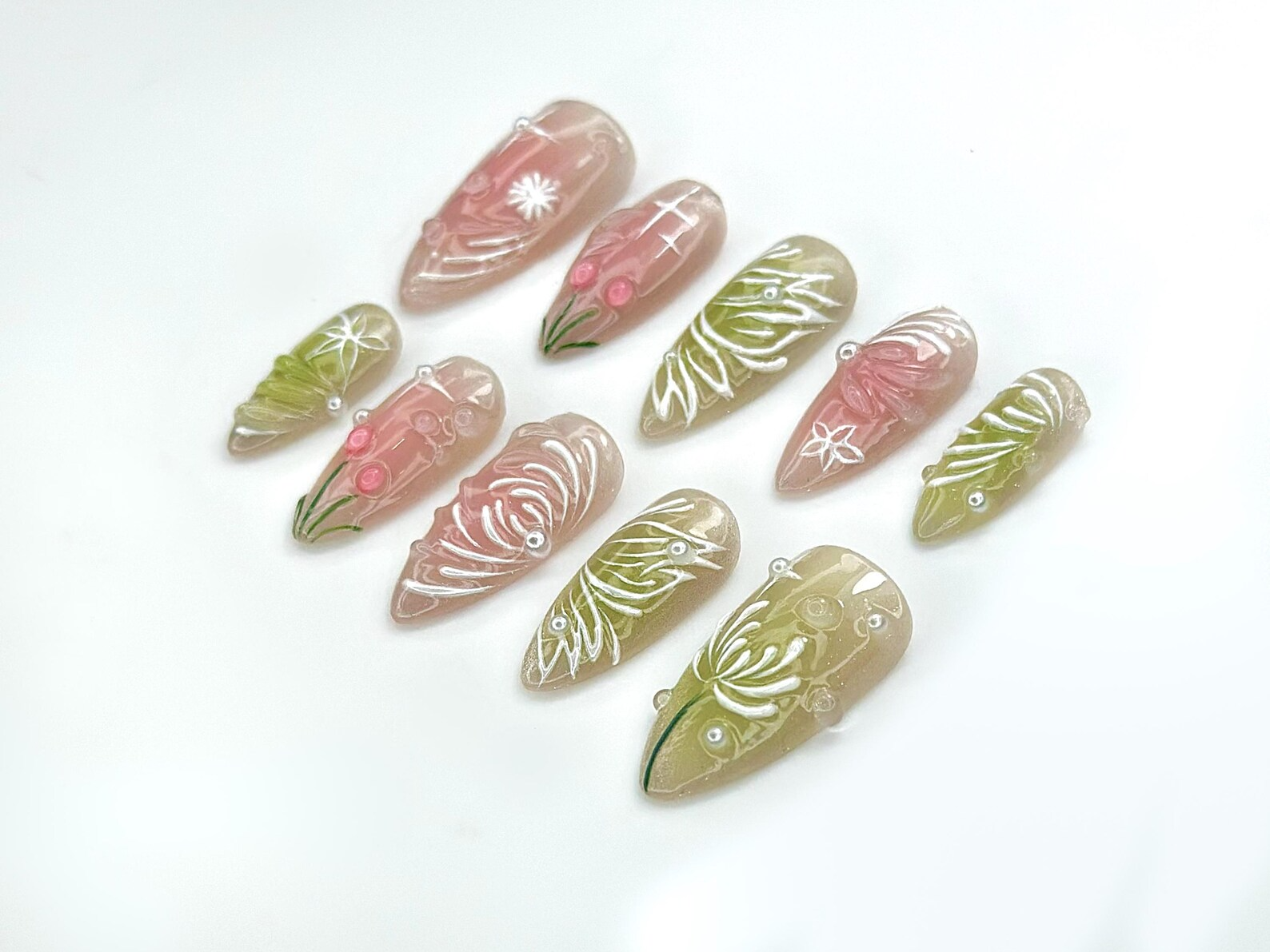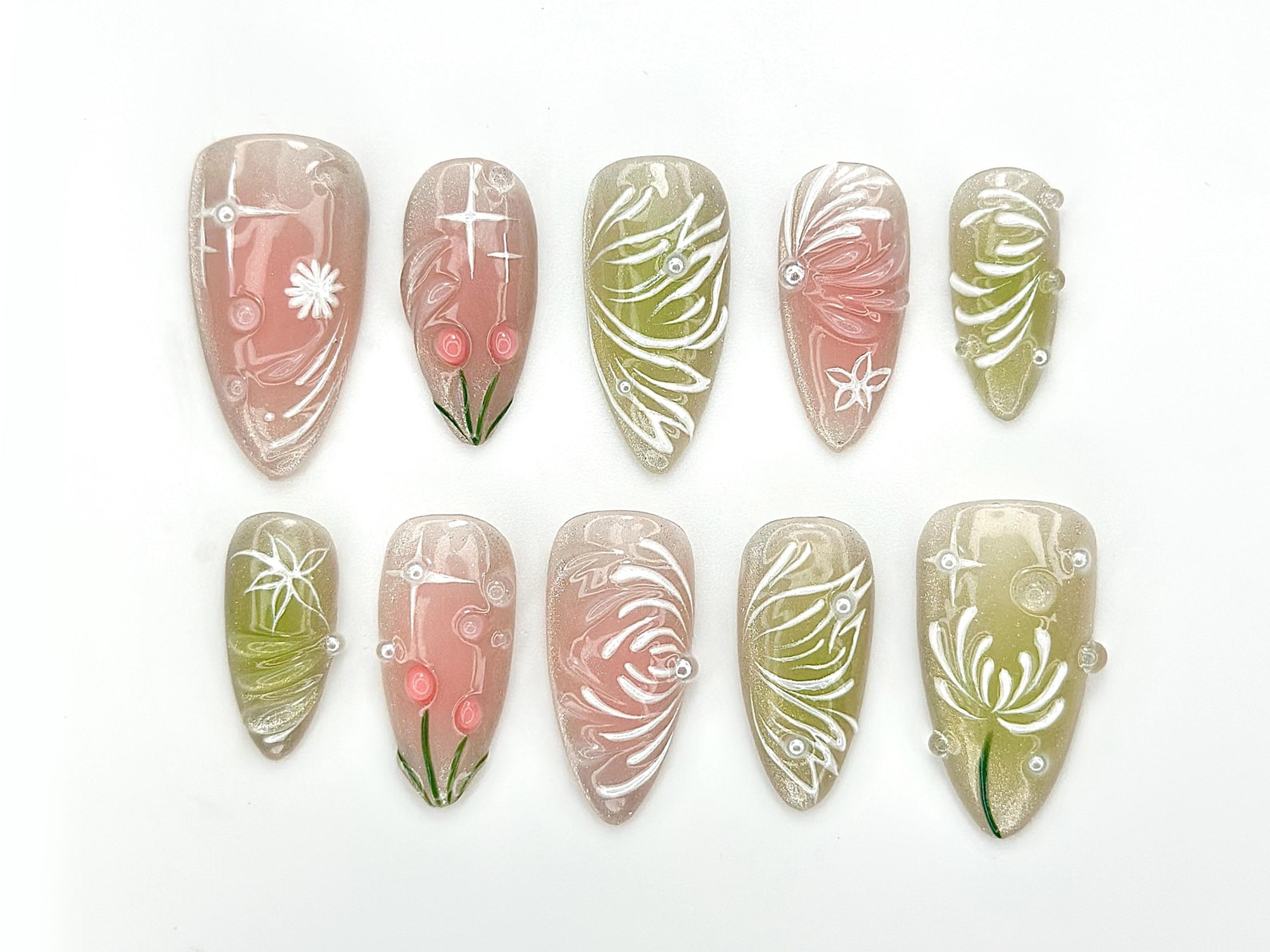 Dewdrop Meadow Press On Nails | Pastel Green & Pink Shimmer | Hand-Painted Floral Line Art and Crystal Accents | JB987EK