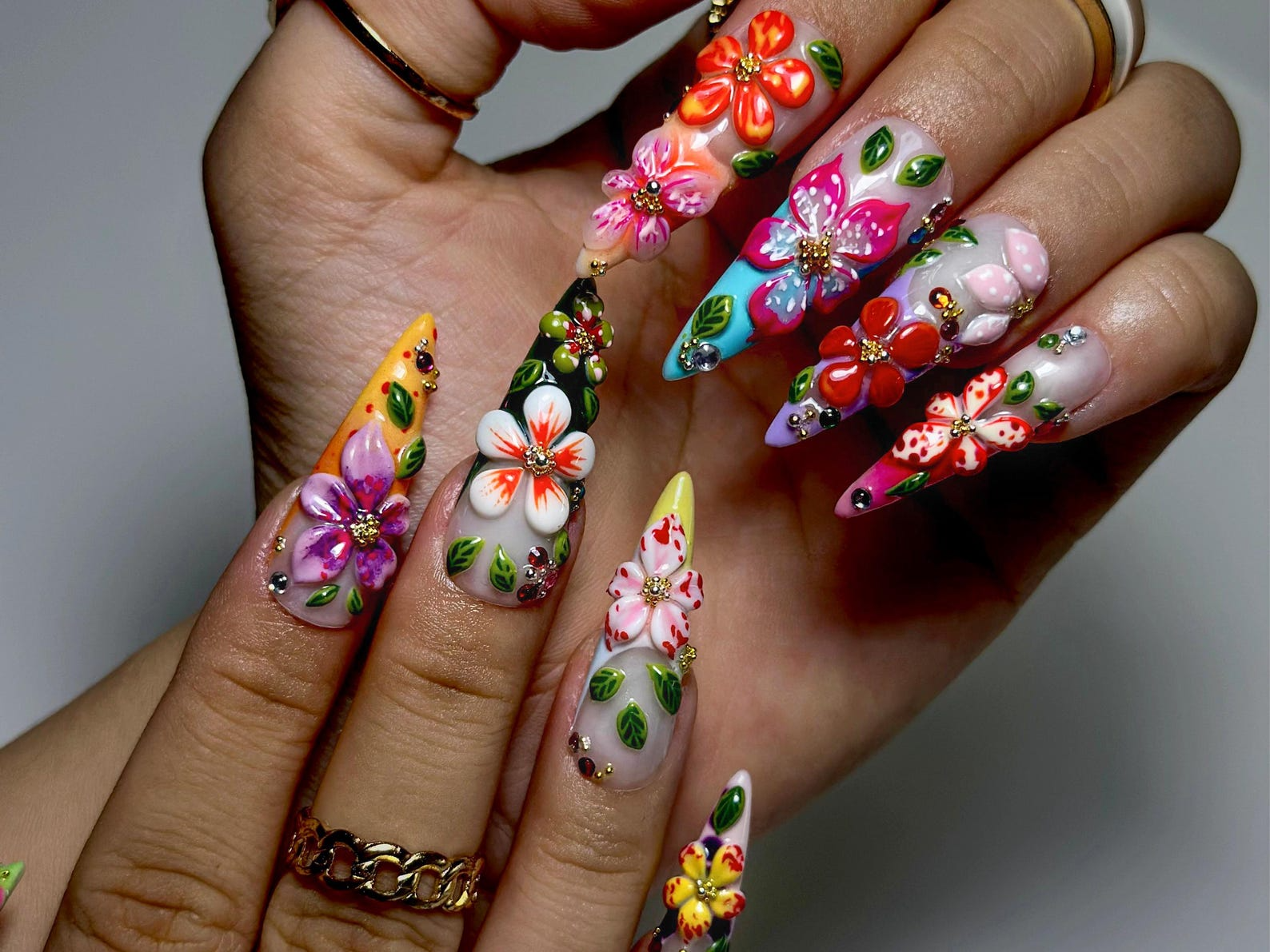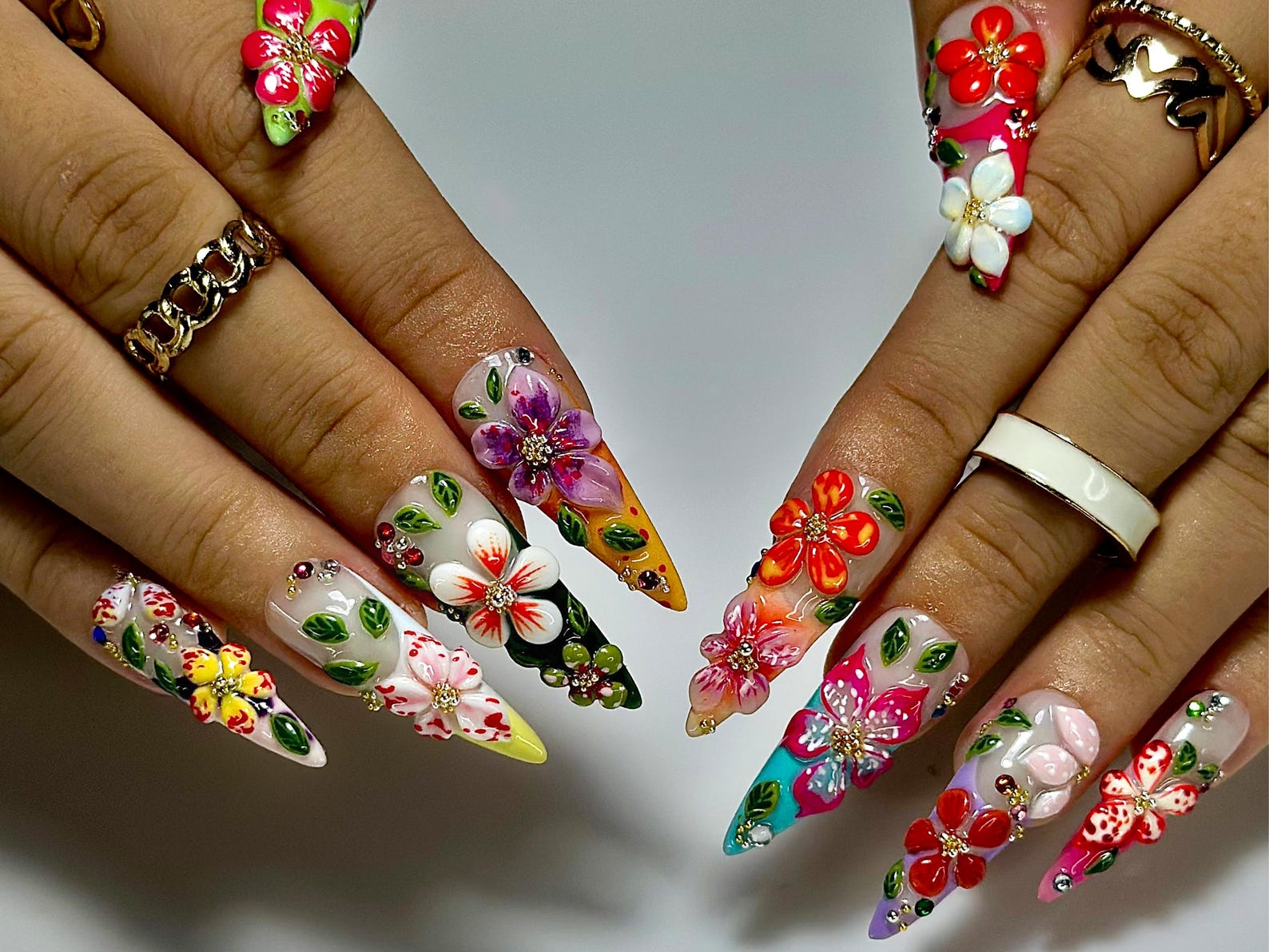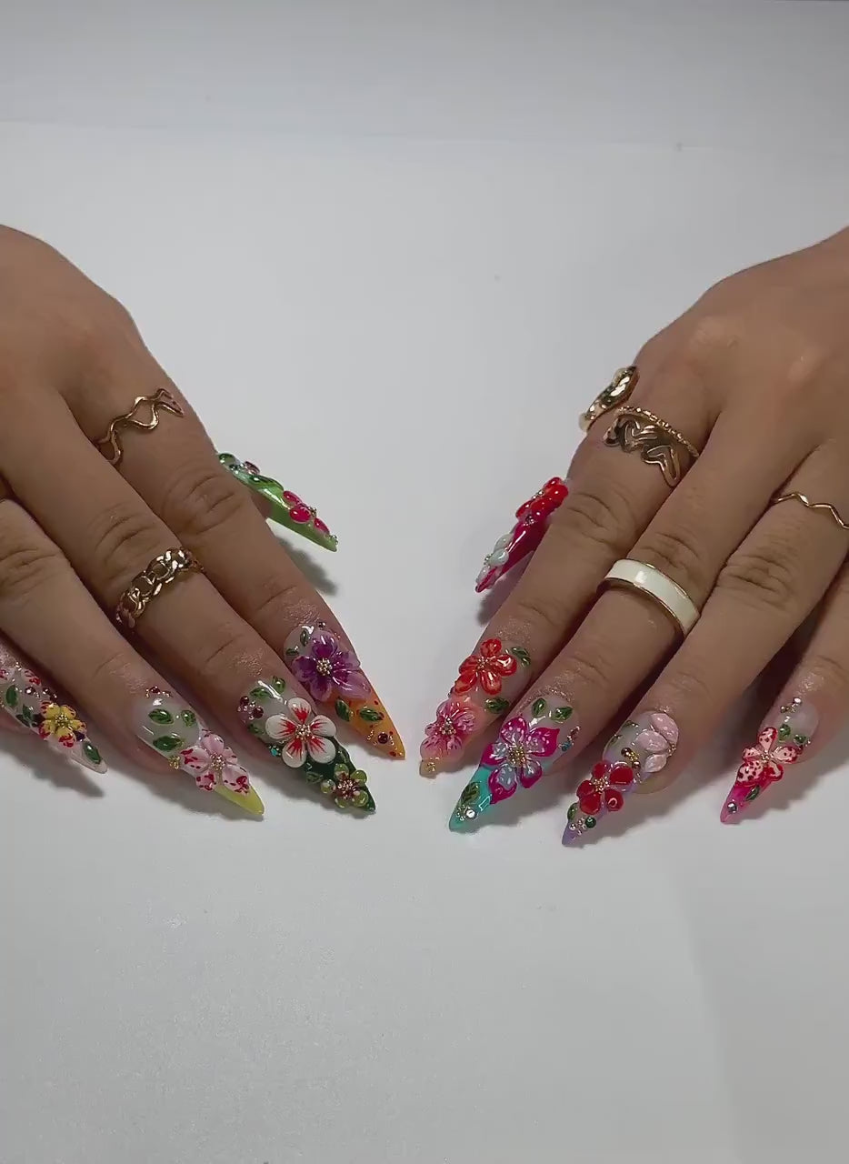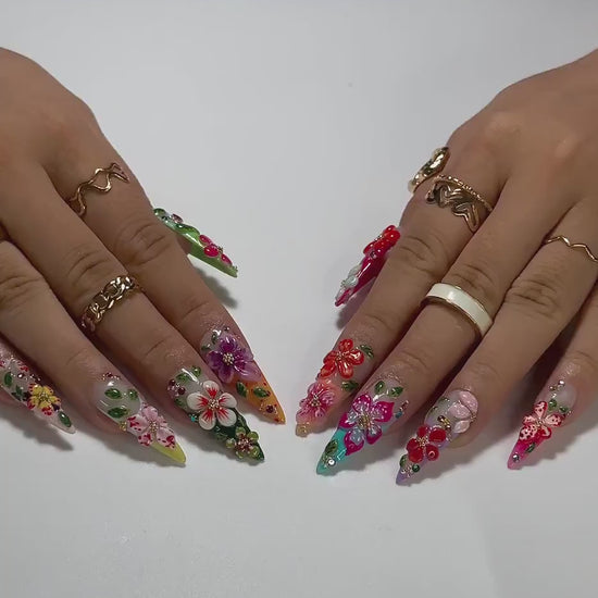 Tropical Garden Explosion Press On Nails | 3D Colorful Floral Nail Art | Rainbow Gradient Tips with Leaves & Gems | JB989EC