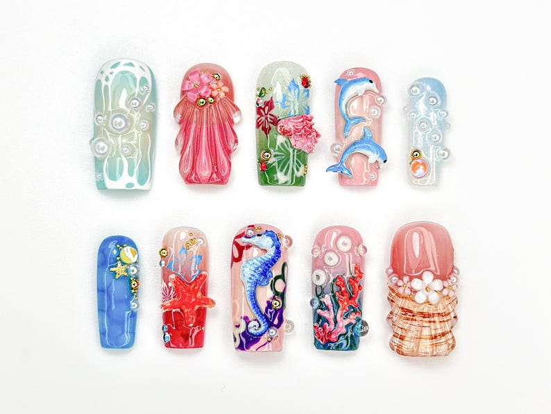 Summer Press On Nails with 3D Seashells and Pearls | Mermaid Dolphin Coral Shell Design | Summer Beach Vibe Nails | Sea Life Nails | JB923H