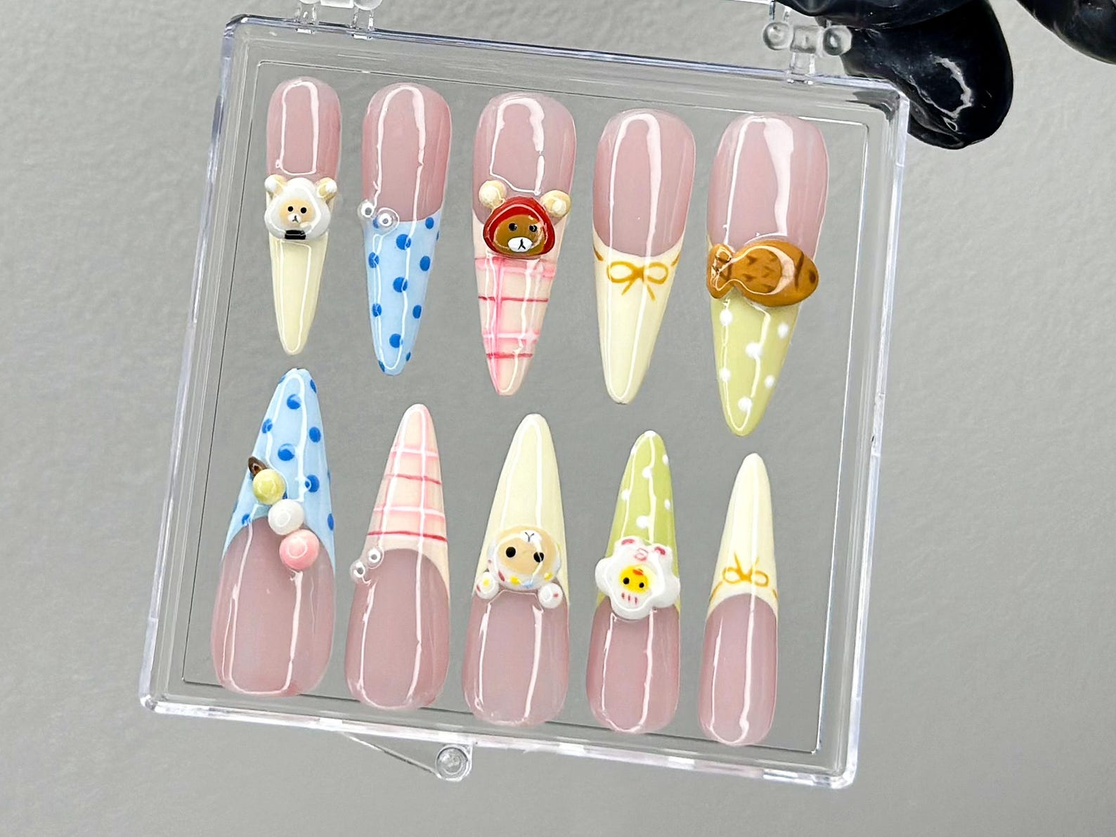 Cute 3D Cartoon Press On Nails | Pastel Kawaii Nail Art | 3D Bear Picnic Press Ons | Gingham Pastel Fake nails |Animal Kawaii Nails |HB990YK