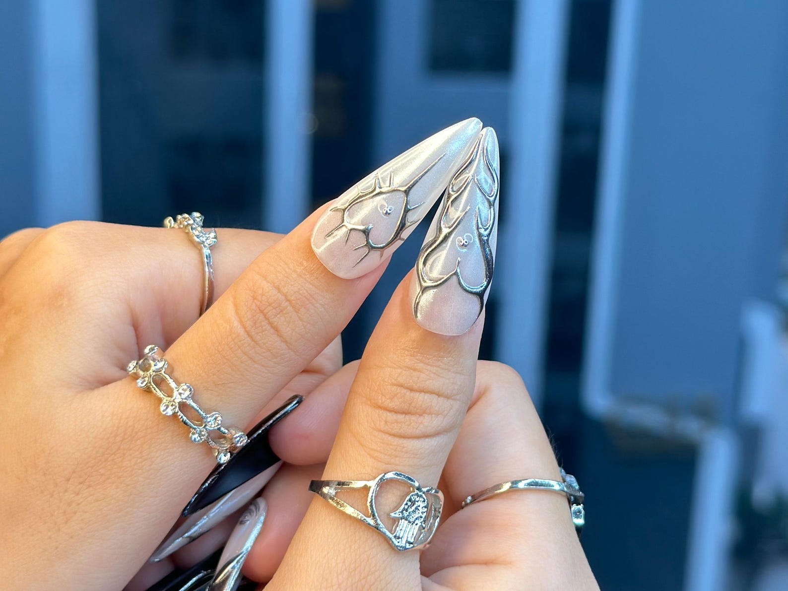 This is a sleek black and silver press-on nail set by DoryNail. The nails feature a futuristic design with intricate silver patterns and black bases, creating a bold and edgy look. Each nail is uniquely crafted with metallic accents and sharp geometric shapes, perfect for making a statement.