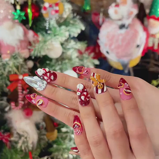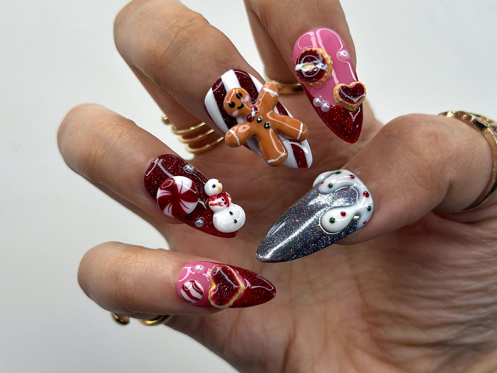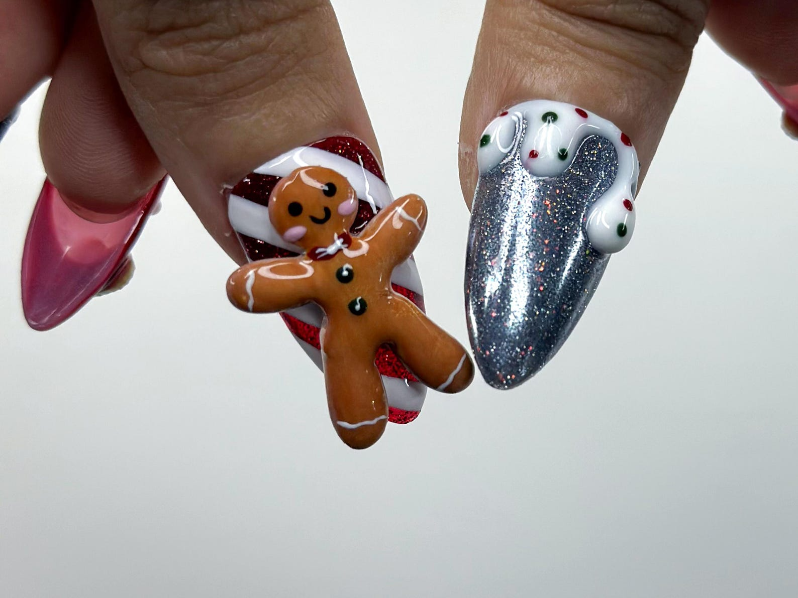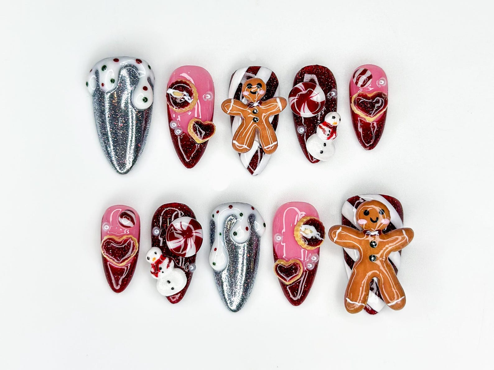 Gingerbread Red Christmas Press On Nails | 3D Christmas Cookie Nail | Peppermint & Snowman Holiday Nails| Red Glitter Festive Nails |JB216HC