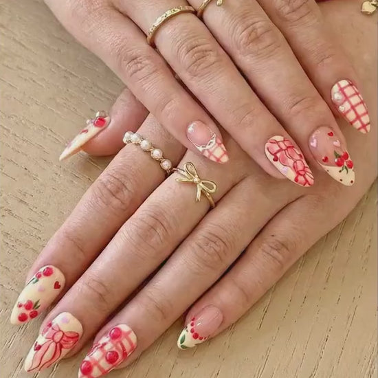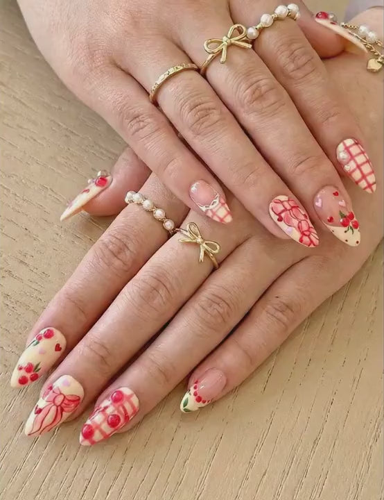 Press On Nails Adhesive Tabs – Cherry Heart & Pink Ribbon Nude Press On Nails, Handmade Valentine Fake Nails Sweet Romantic Nail Art