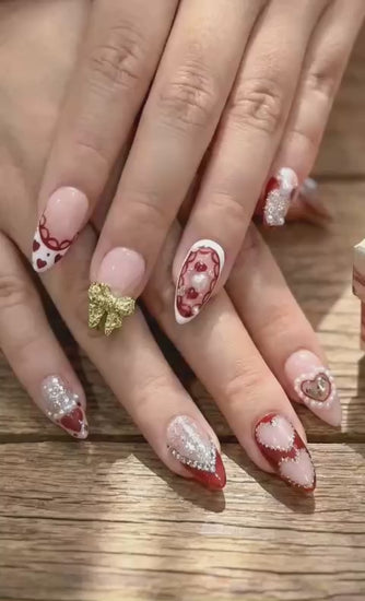 Press On Nails Adhesive Tabs – Nude Red Heart & Glitter Bow Design Long Almond Handmade Fake Nails for Valentine Gift