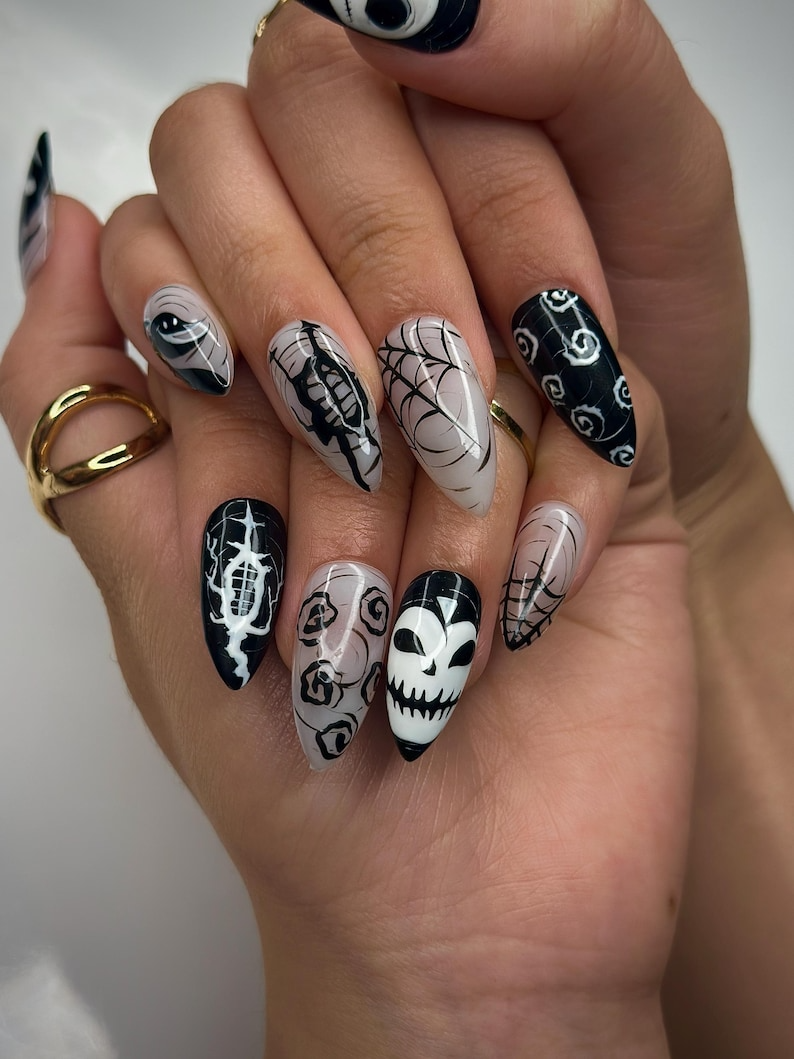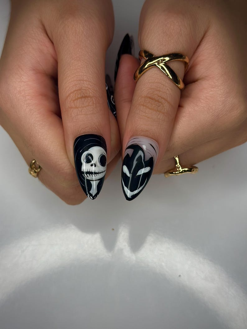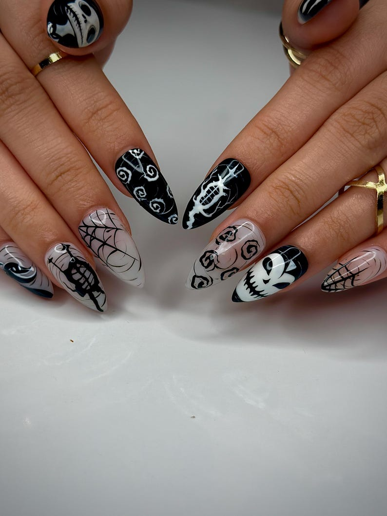 Gothic Skull Halloween Press On Nails | Black & White Creepy Nail Art | Halloween Horror Inspired | Unique Gothic Nail Set| JB150HC
