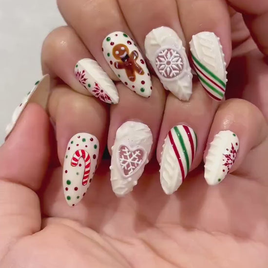 Candy Sweater Christmas Press On Nails | Snowflake Winter Nail Art | Red Green Stripe Holiday Nails |3D Cable Knit Nail | HB1212EC