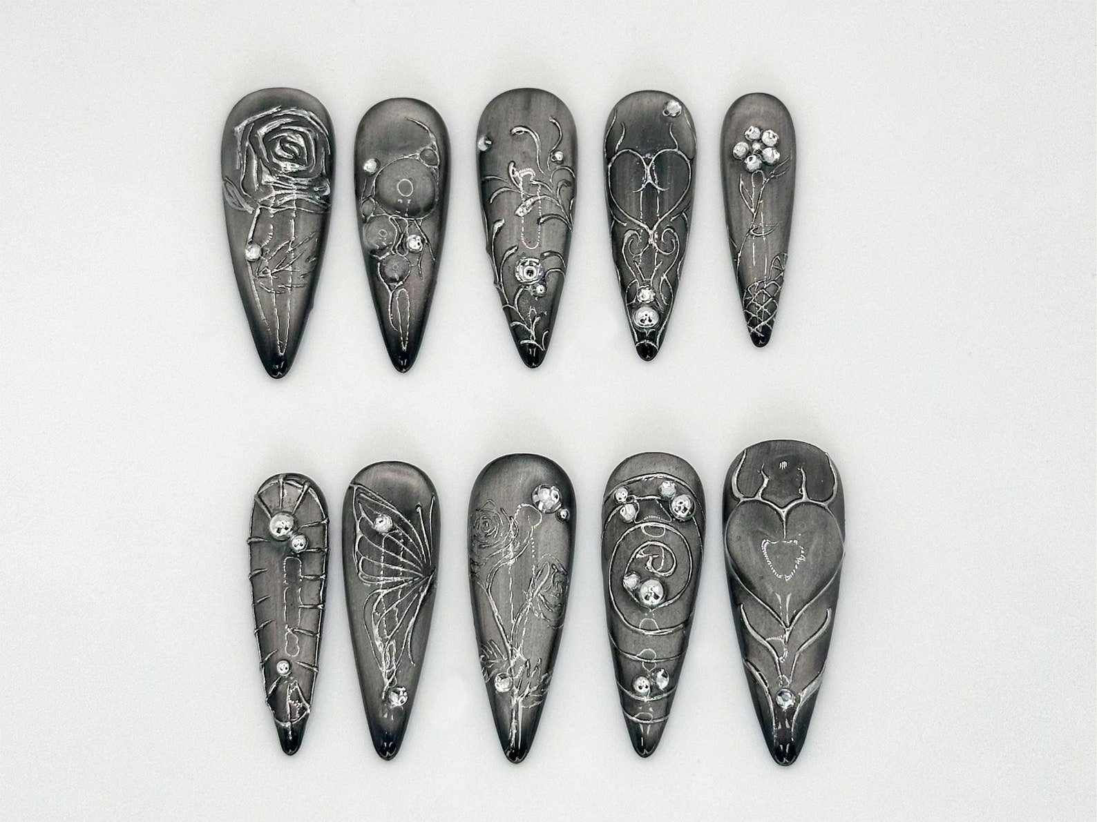 Elegant Silver Gothic Press-On Nails | Intricate Butterfly and Rose Silver Nails | Luxury Silver Gothic | Butterfly & Rose Design | JC630LC