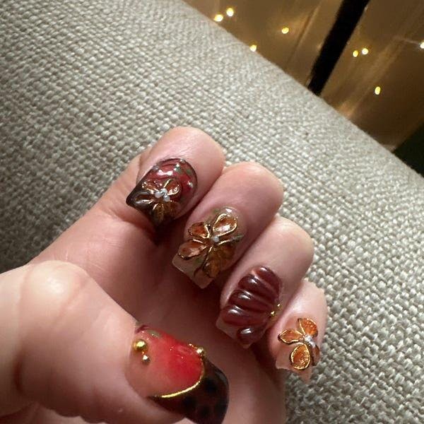 Custom Brown Floral Press-On Nails | Fall Leaves Design | Brown and Orange 3D Nail Art | Custom Nail Design | Autumn Elegance | JB595H