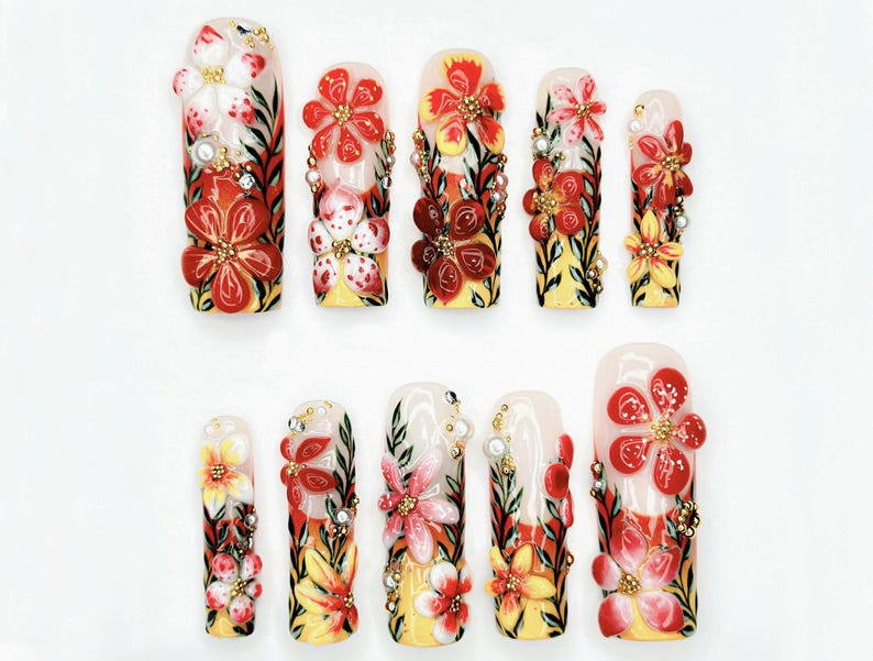 Tropical Bloom Garden Press On Nails | 3D Floral Art Nail Set | Handpainted Exotic Flower Nails | Summer Paradise Tips | JA946EC