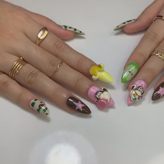 Camo Monkey Fun Press On Nails | Cartoon Camouflage Nails | Banana & Monkey Nail Design | Pink Green Star Press Ons | Funky Nails | JC963HC