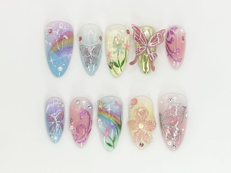 Nature-Inspired Floral Press-On Nails | Floral And Butterfly Long Nails | Butterfly And Glitter Nails | Hand-Painted Nail Art | JB634HC
