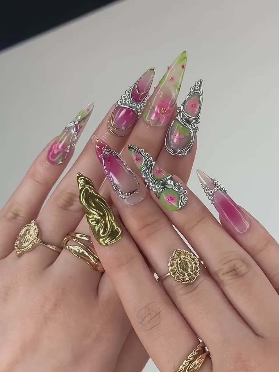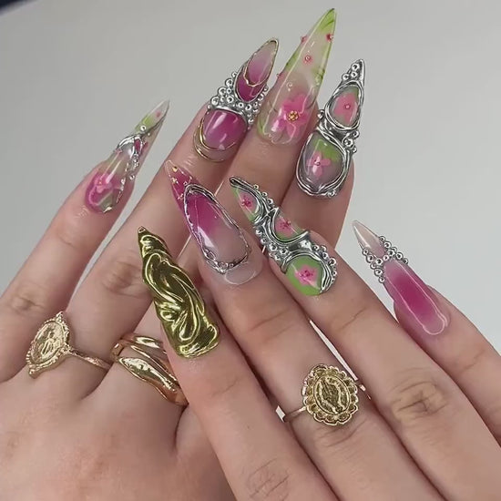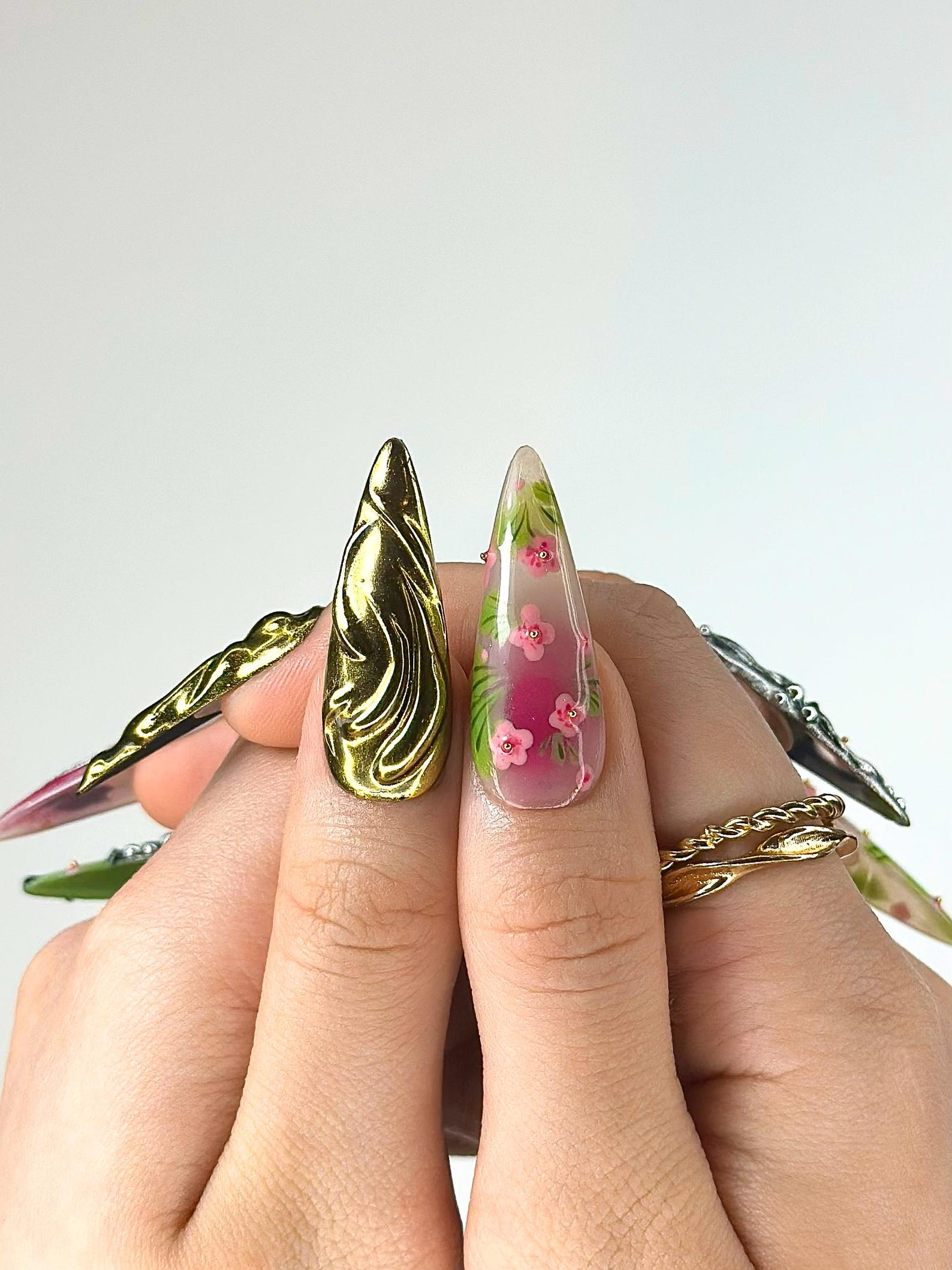 3D Luxury Floral Press On Nails | Flower Gold Chrome Nails | Handmade Statement Nail Art | Elegant Long Press Ons | HB997GK
