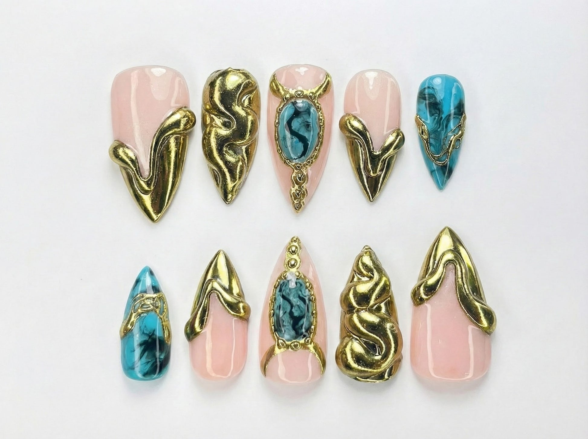 Metallic Turquoise Gold Press On Nails | Luxury Abstract Chrome Fake Nails |3D Sculpture Nail Art | Stone Acrylic Nails|HB833YC