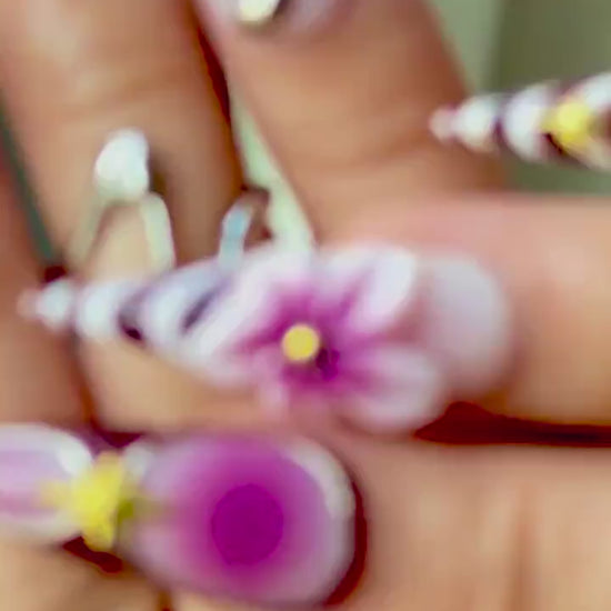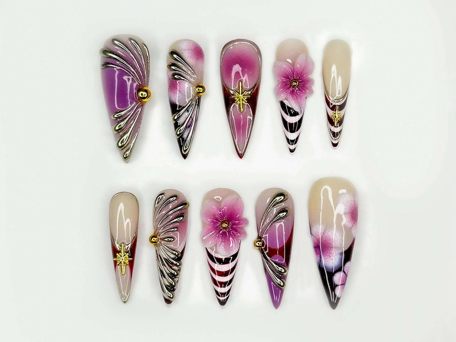 A dreamy mix of metallic wing details, soft ombre plum tones, and delicate 3D cherry-blossom blooms — perfect for anyone who loves an elegant, artistic statement set.