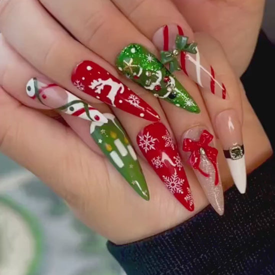 Cozy Knit Christmas Press On Nails | Red Green Holiday Nail Art |Festive Tree & Ribbon Design| Candy Cane And Snowflake Design | HB1195EK